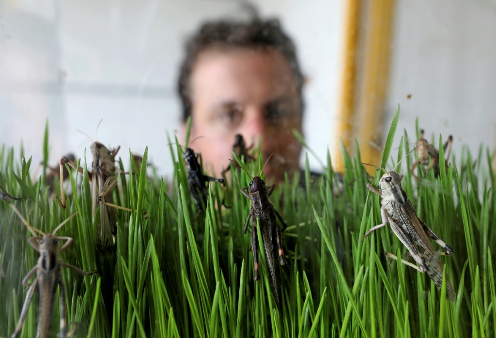 - © 2020 AFP | Crée le 04.08.2020 à 05h10 | Mis à jour le 04.08.2020 à 05h15ImprimerUn employé de l'entreprise israélienne Hargol surveille des sauterelles d'élevage, le 12 juillet 2020 à Kidmat Tzvi, dans le plateau du Golan MENAHEM KAHANA-AFP