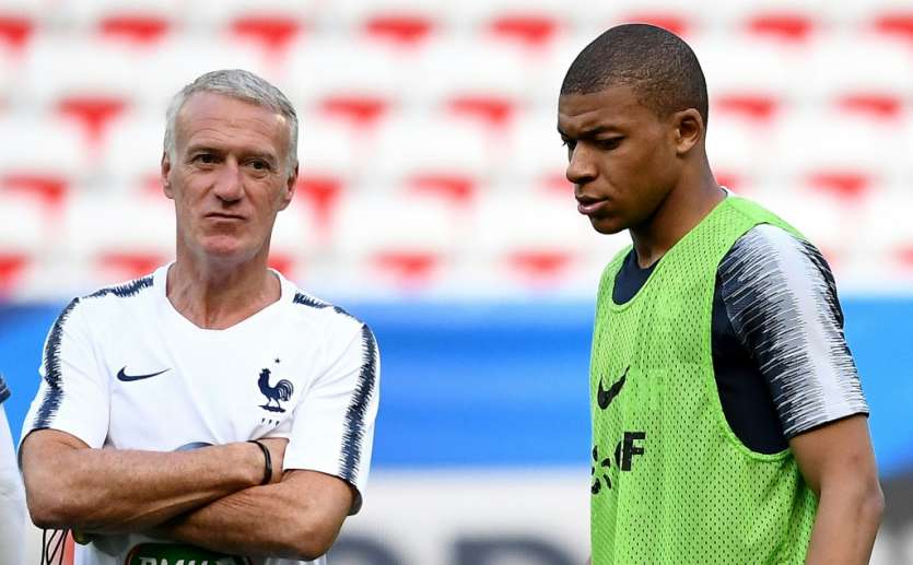 - © 2018 AFP | Crée le 04.06.2018 à 22h30 | Mis à jour le 04.06.2018 à 22h35ImprimerLe sélectionneur de l'équipe de France Didier Deschamps (g) parle à Kylian Mbappé lors d'une séance d'entraînement à l'Allianz Riviera, le 31 mai 2018 FRANCK FIFE-AFP/Archives