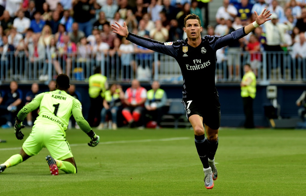 - © 2017 AFP | Crée le 22.05.2017 à 07h30 | Mis à jour le 22.05.2017 à 07h35ImprimerL'attaquant du Real Madrid Cristiano Ronaldo exulte après avoir ouvert le score pour le Real Madrid face à Malaga, le 21 mai 2017 à Malaga JOSE JORDAN-AFP