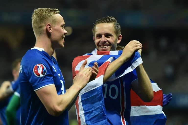 - © 2016 AFP | Crée le 28.06.2016 à 21h15 | Mis à jour le 28.06.2016 à 21h20ImprimerLes Islandais Kolbeinn Sigthorsson (g) et Gylfi Sigurdsson en joie après la qualification de leur équipe en quarts de finale de l'Euro face à l'Angleterre à l'Allianz Riviera, le 27 juin 2016