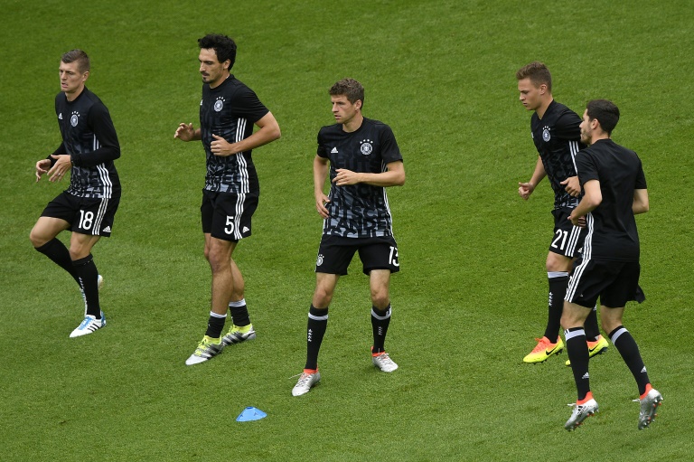 - © 2016 AFP | Crée le 22.06.2016 à 02h40 | Mis à jour le 22.06.2016 à 02h45ImprimerLes joueurs allemands à l'échauffement, le 21 juin 2016 au Parc des Princes avant le match de l'Euro contre l'Irlande du Nord