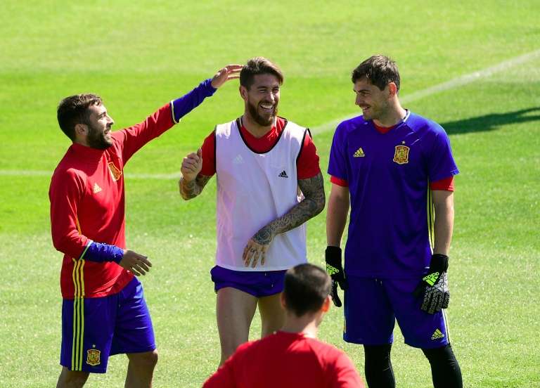 - © 2016 AFP | Crée le 28.06.2016 à 01h46 | Mis à jour le 28.06.2016 à 01h50ImprimerLes défenseurs Jodi Alba (g), Sergio Ramos (c) et le gardien Iker Casillas lors d'une séance d'entrraînement avec l'équipe d'Espagne à Saint-Martin-de-Ré, le 26 juins 2016