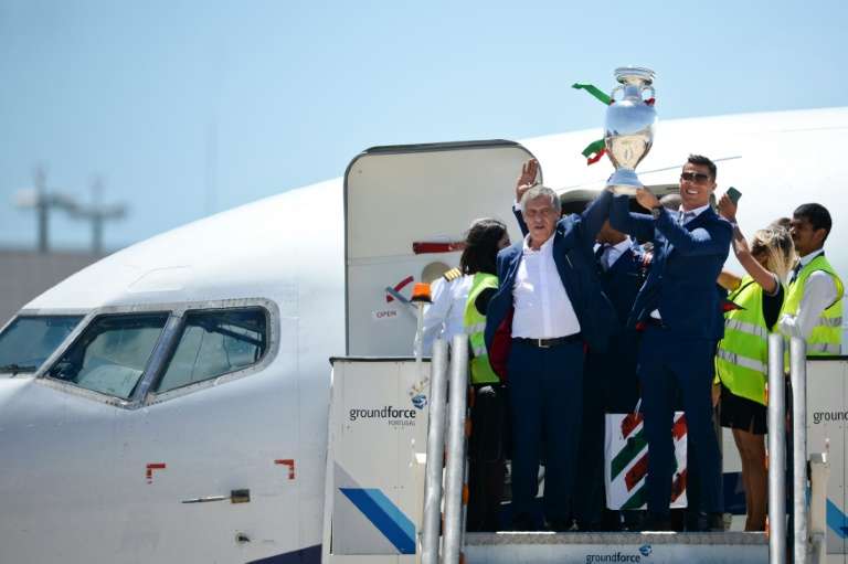 - © 2016 AFP | Crée le 11.07.2016 à 23h25 | Mis à jour le 11.07.2016 à 23h30ImprimerL'entraîneur du Portugal Fernando Santos (g) et Cristiano Ronaldo soulèvent le trophée à la sortie de l'avion à Lisbonne, après la victoire dimanche contre la France en finale de l'Euro, le 11 juillet 2016