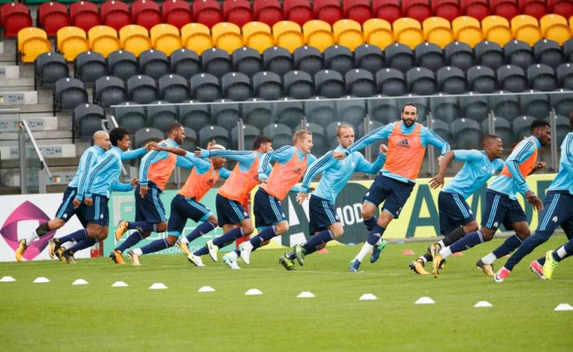 - © 2017 AFP | Crée le 03.08.2017 à 23h21 | Mis à jour le 03.08.2017 à 23h25ImprimerLes joueurs de l'Olympique de Marseille à l'entraînement sur la pelouse d'Ostende, le 2 août 2017 pour le match retour de l'Europa League KURT DESPLENTER-Belga/AFP