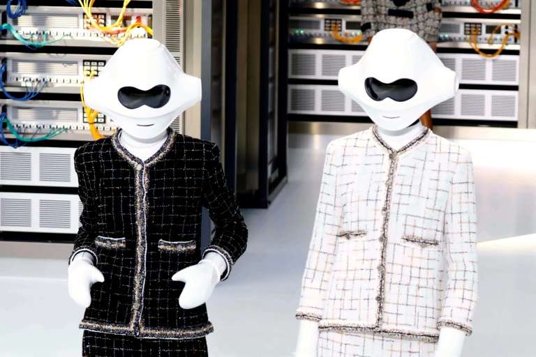 Deux mannequins, casques blancs sur la tête et semblables au robot humanoïde Pepper, ont ouvert le défilé, vêtues de l'emblématique tailleur de la griffe au "double C", à l'avant-dernier jour de la Fashion Week parisienne.