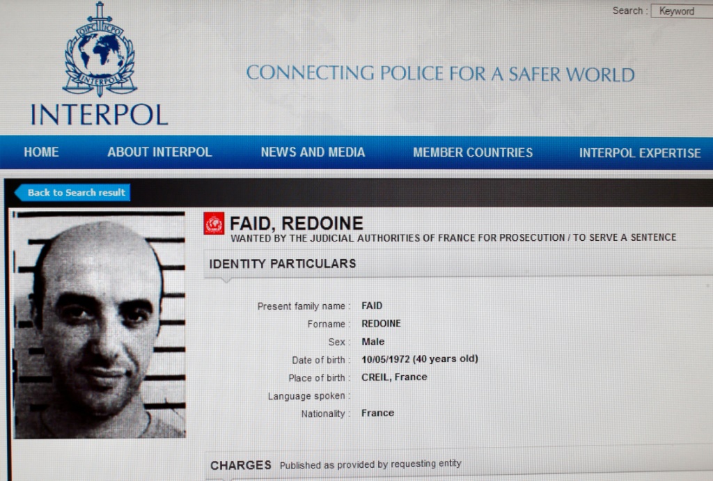 - © 2018 AFP | Crée le 04.10.2018 à 09h53 | Mis à jour le 04.10.2018 à 09h55ImprimerUne reproduction du site d'Interpol montrant la fiche de recherche du braqueur français Redoine Faïd, échappé de sa prison de Réau (Seine-et-Marne) le 1er juillet 2018 --INTERPOL/AFP/Archives