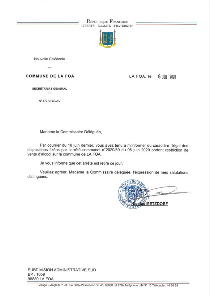 Il y a un mois, le lundi 8 juin, Corinne Voisin, alors maire de La Foa, avait pris un arrêté qui interdisait la vente d’alcool à emporter les vendredis, les samedis et les dimanches, à partir de midi, ainsi que les veilles de jours fériés et les jours fériés.