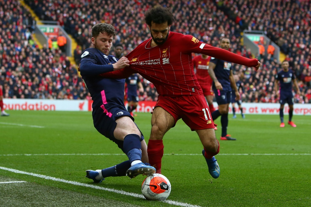 - © 2020 AFP | Crée le 26.04.2020 à 06h07 | Mis à jour le 26.04.2020 à 06h10ImprimerLe milieu égyptien de Liverpool, Mohamed Salah (d), à la lutte avec le défenseur de Bournemouth, Jack Simpson, lors du match de Premier League à Anfield, le 7 mars 2020 GEOFF CADDICK-AFP/Archives