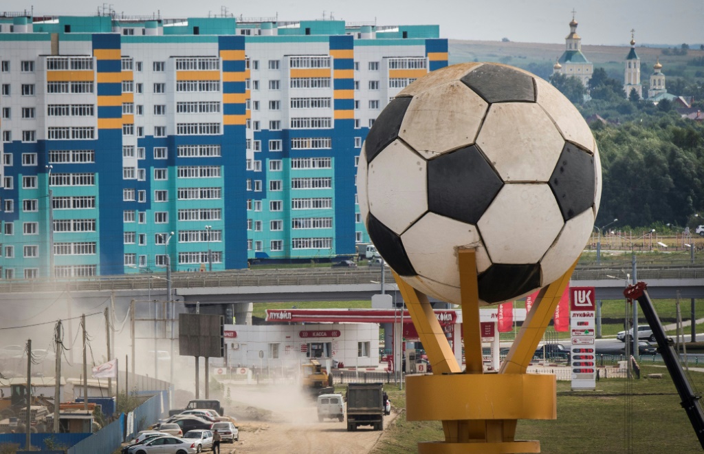 - © 2017 AFP | Crée le 26.08.2017 à 00h46 | Mis à jour le 26.08.2017 à 00h50ImprimerBallon de foot géant érigé à Saransk en Russie, le 25 août 2017 Mladen ANTONOV-AFP