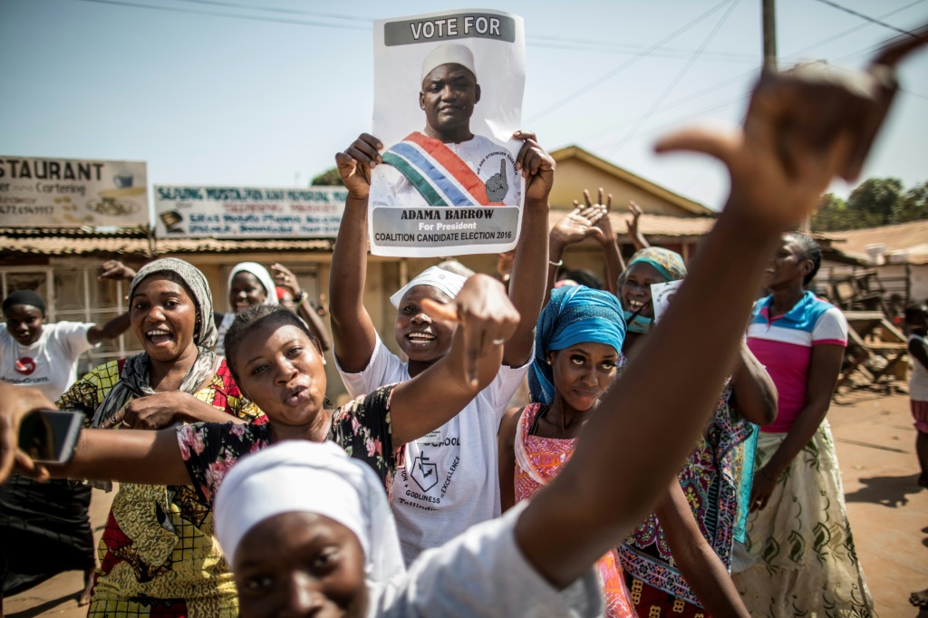 - © 2017 AFP | Crée le 19.01.2017 à 05h05 | Mis à jour le 19.01.2017 à 05h10ImprimerDes partisans d'Adama Barrow, vainqueur de la présidentielle, brandissent son portrait, le 2 décembre 2016 à Serekunda en Gambie MARCO LONGARI-AFP/Archives