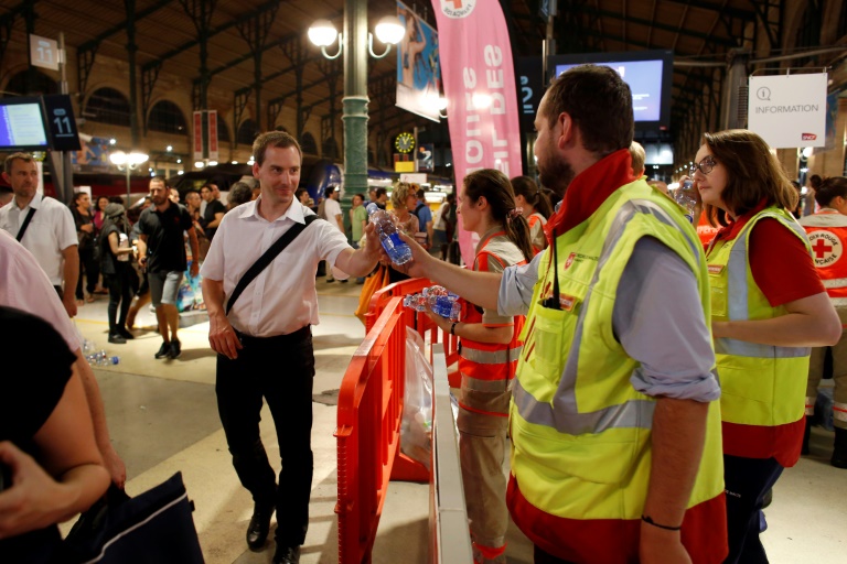 La protection civile, dont des ambulances sont stationnées devant la gare, a tendu des bâches blanches et prenait en charge les personnes incommodées. Certaines, en état de faiblesse apparente lors de cette première journée de très forte chaleur, étaient évacuées sur des brancards ou chaises roulantes.