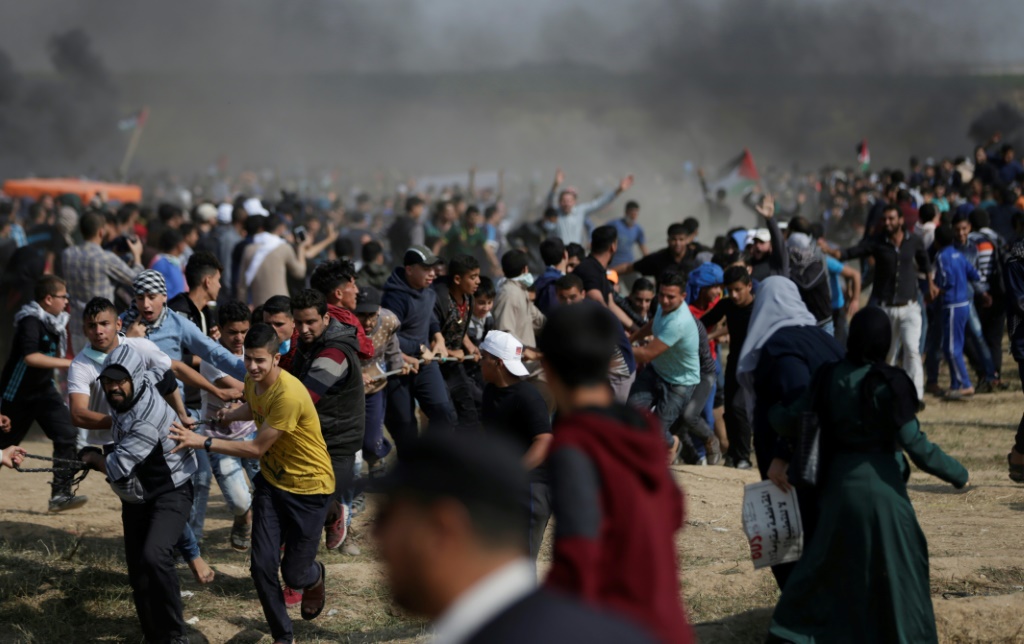 - © 2018 AFP | Crée le 28.04.2018 à 17h04 | Mis à jour le 28.04.2018 à 17h10ImprimerHeurts entre manifestants palestiniens et soldats israéliens dans la bande de gaza, le long de la frontière israélienne le 27 avril 2018 MAHMUD HAMS-AFP