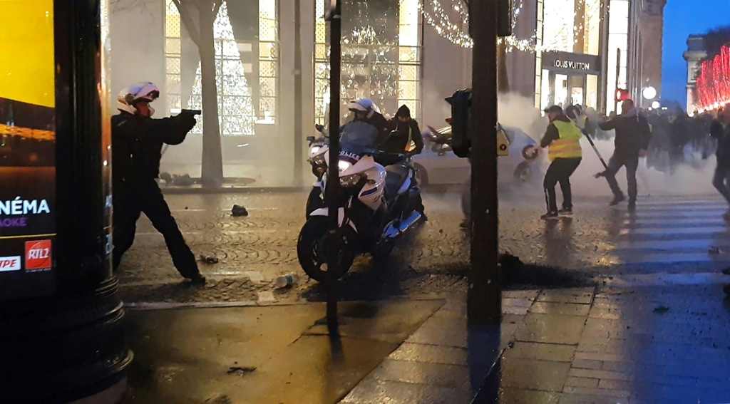 - © 2018 AFP | Crée le 24.12.2018 à 00h13 | Mis à jour le 24.12.2018 à 00h15ImprimerCapture vidéo d'un policier filmé le 22 décembre 2018 sur les Champs-Elysées à Paris --PRESSELINE/AFP