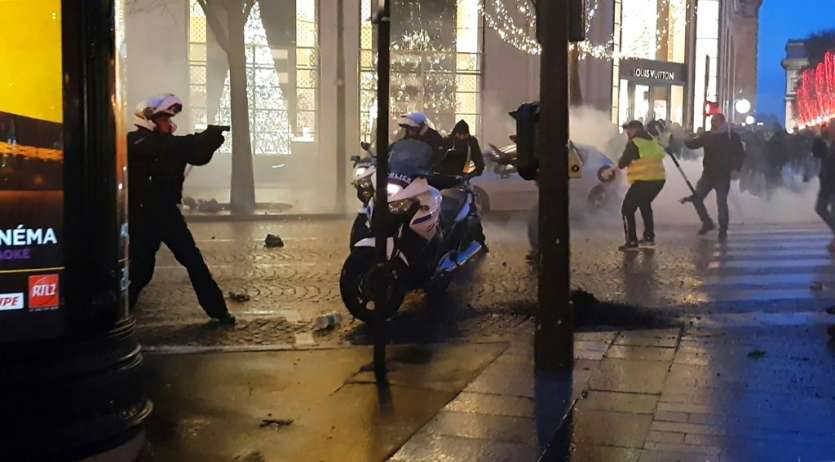 La scène s'est déroulée au croisement de l'avenue George V et des Champs-Elysées, en fin de journée alors que les forces de l'ordre évacuaient progressivement les Champs, au sixième samedi consécutif de manifestations de "gilets jaunes".