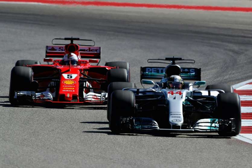 - © 2017 AFP | Crée le 23.10.2017 à 07h49 | Mis à jour le 23.10.2017 à 07h50ImprimerLe Britannique Lewis Hamilton (Mercedes) devant l'Allemand Sebastien Vettel (Ferrari) lors du GP des Etats-Unis de F1, le 22 octobre 2017 à Austin CLIVE MASON-Getty/AFP