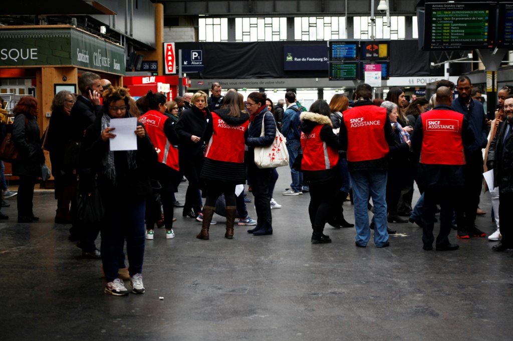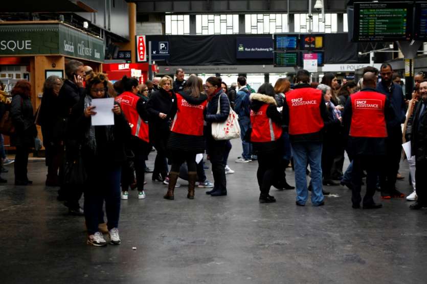 - © 2018 AFP | Crée le 03.04.2018 à 23h22 | Mis à jour le 03.04.2018 à 23h25ImprimerAgents d'information de la SNCF, Gare du Nord à Paris, le 3 avril 2018 STR-AFP