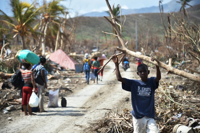 - © 2016 AFP | Crée le 11.10.2016 à 16h14 | Mis à jour le 11.10.2016 à 16h20ImprimerDes Haïtiens dans une rue dévastée après le passage de l'ouragan Matthew le 10 octobre 2016 à Les Cayes