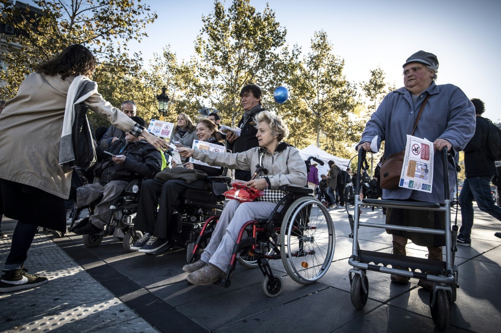 - © 2018 AFP | Crée le 27.09.2018 à 01h53 | Mis à jour le 27.09.2018 à 01h55ImprimerDes militants distribuent leurs revendications devant une station de métro à Paris, lors d'une manifestation de l'association APF France Handicap, le 26 septembre 2018 Philippe LOPEZ-AFP