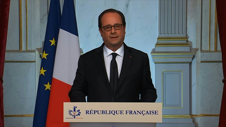 - © 2016 AFP | Crée le 16.07.2016 à 21h59 | Mis à jour le 16.07.2016 à 22h05ImprimerImage tirée d'une vidéo de TF1 montrant le président François Hollande à l'Elysées, le 15 juillet 2016