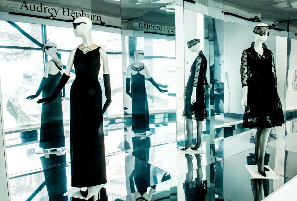 Un important espace est dédié à sa muse, l'actrice Audrey Hepburn, habillée au cinéma comme dans la vie par le couturier, devenu un ami. Un must: la célèbre robe longue noire qu'elle porte dans "Breakfast at Tiffany's", avec des lunettes de soleil rondes et un collier à multiple rangs de perles.