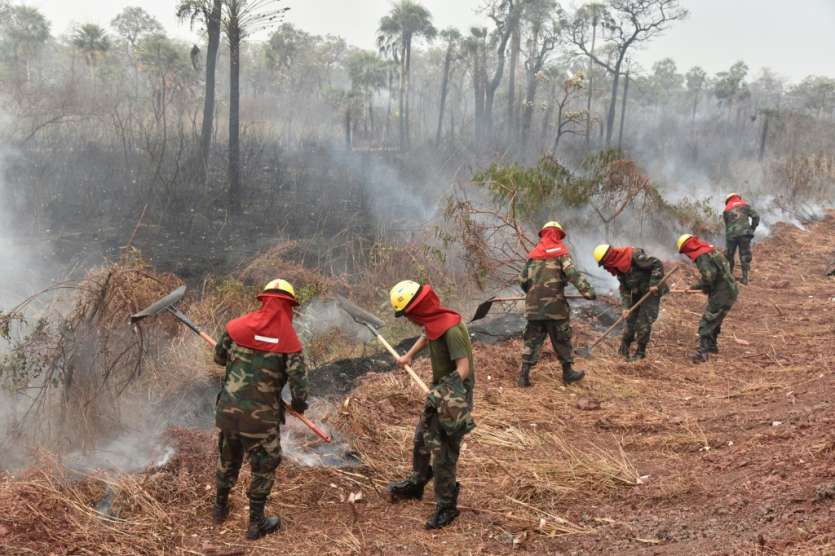 - © 2019 AFP | Crée le 27.08.2019 à 16h34 | Mis à jour le 27.08.2019 à 16h40ImprimerDes pompiers luttent contre des feux de forêt dans le parc national Otuquis, le 26 août 2019 en Bolivie Aizar RALDES-AFP
