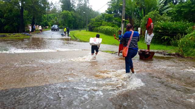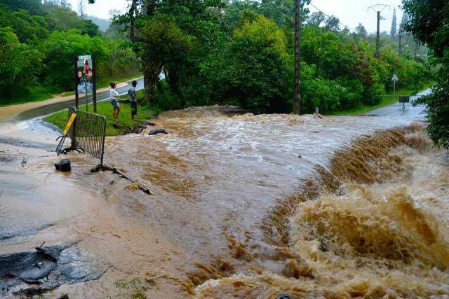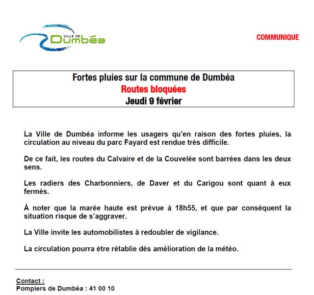 Dans un communiqué, la mairie de Dumbéa informe les usagers des routes et radiers coupés et prévient que la situation risque de s'aggraver à l'approche de 18h55 et de la marée haute.