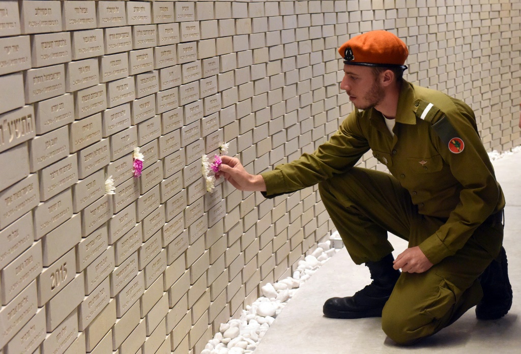 - © 2018 AFP | Crée le 18.04.2018 à 23h14 | Mis à jour le 18.04.2018 à 23h15ImprimerUn soldat israélien place une fleur sur les noms des soldats tués au service de leur pays ou dans des attentats, à Jérusalem, à l'occasion du Jour du Souvenir, le 18 avril 2018 DEBBIE HILL-POOL/AFP