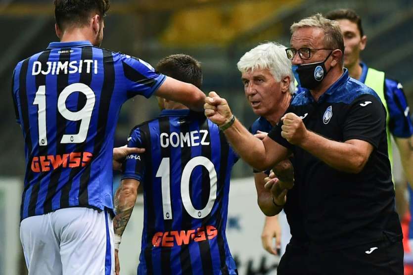 - © 2020 AFP | Crée le 29.07.2020 à 09h00 | Mis à jour le 29.07.2020 à 09h05ImprimerPapu Gomez félicité par son entraîneur Gian PIero Gasperini et par ses coéquipiers après son but pour l'Atalanta à Parme, le 28 juillet 2020 MIGUEL MEDINA-AFP
