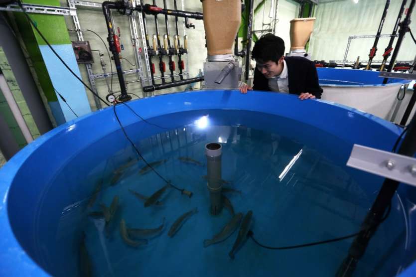 - © 2018 AFP | Crée le 28.02.2018 à 22h46 | Mis à jour le 28.02.2018 à 22h50ImprimerL'homme d'affaires japonais Tetsuro Sogo, qui expérimente une nouvelle technique d'élevage, regarde des saumons gris dans un bassin, le 30 janvier 2018 à Saitama Farzaneh KHADEMIAN-AFP