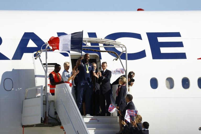 Premier à sortir de l'avion, le porte-drapeau et star de la délégation française, Teddy Riner, étendard bleu-blanc-rouge à la main et médaille d'or des lourds en judo autour du cou.