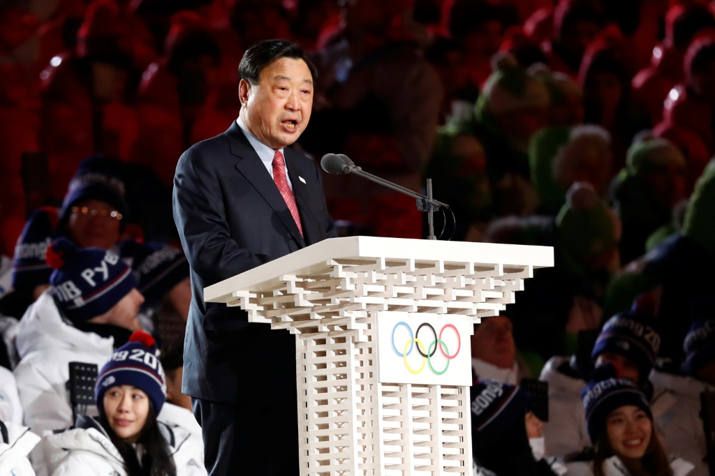 - © 2018 AFP | Crée le 10.02.2018 à 18h39 | Mis à jour le 10.02.2018 à 18h45ImprimerLe président du Comité d'organisation des JO de Pyeongchang (POCOG) fait une allocution lors de la cérémonie d'ouverture des Jeux, le 9 février 2018 à Pyeongchang Odd ANDERSEN-AFP