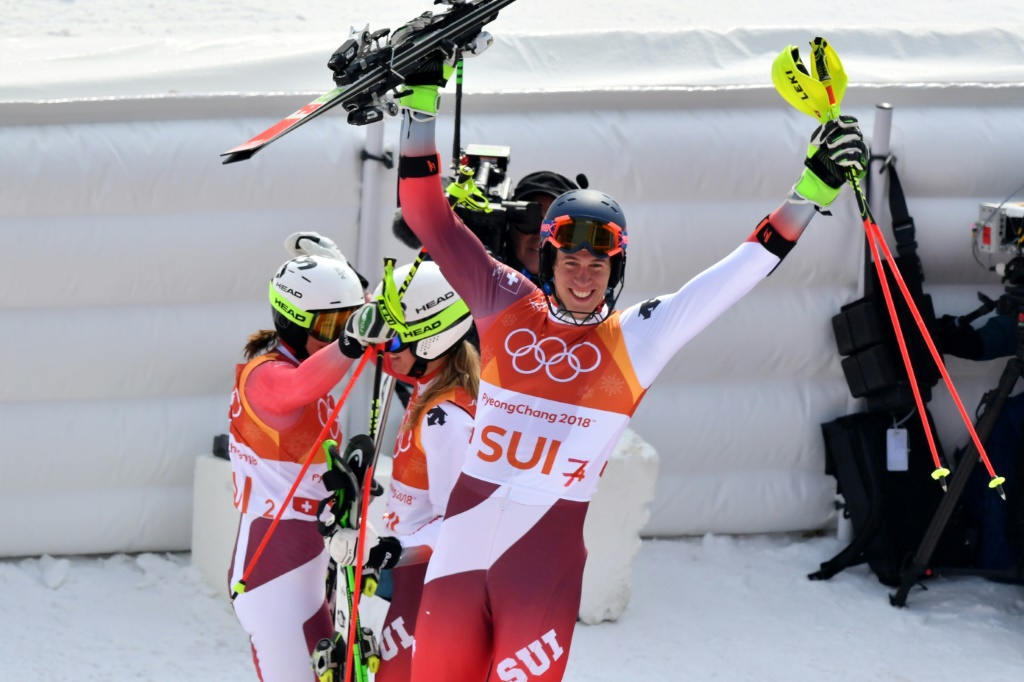 - © 2018 AFP | Crée le 24.02.2018 à 14h56 | Mis à jour le 24.02.2018 à 15h00ImprimerLe Suisse Ramon Zenhaeusern fou de joie après la victoire de son équipe en slalom parallèle des JO de Pyeongchang le 24 février 2018 Dimitar DILKOFF-AFP