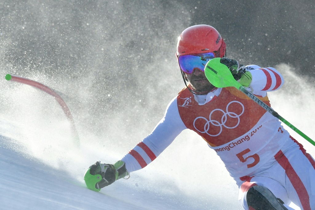 - © 2018 AFP | Crée le 22.02.2018 à 19h16 | Mis à jour le 22.02.2018 à 19h20ImprimerL'Autrichien Marcel Hirscher sort de la piste lors du slalom, à Jeongseon, le 22 février 2018 Dimitar DILKOFF-AFP