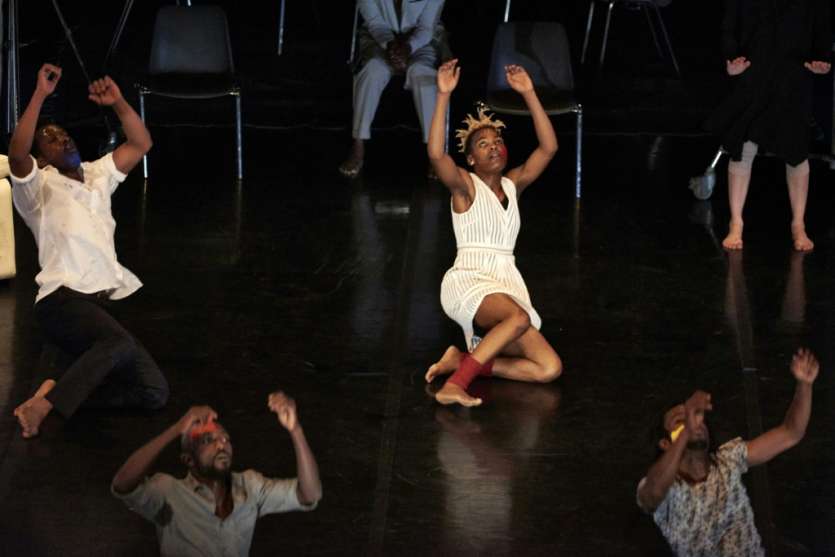 Ils sont sept sur scène, "d'origine burkinabé ou camerounaise. Il y a aussi une artiste blanche, Marion Alzieu. Tous aussi engagés dans la danse", souligne Serge Aimé Coulibaly. Torse nu sous un costume de ville, il danse mais distancé, en retrait des six autres. "Je figure Fela, le chef d'orchestre, et moi-même, le chorégraphe", dit ce militant de la danse, de l'Afrique et des droits de l'Homme.