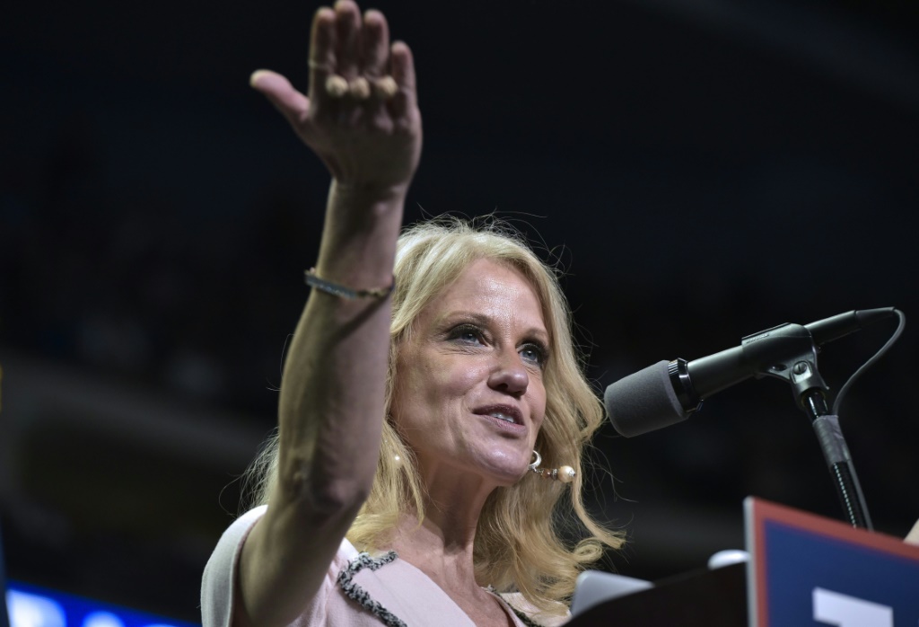 - © 2016 AFP | Crée le 11.11.2016 à 18h10 | Mis à jour le 11.11.2016 à 18h15ImprimerKellyanne Conway, la directrice de campagne de Trump lors d'un meeting à Hershey, le 4 novembre 2016 MANDEL NGAN-AFP