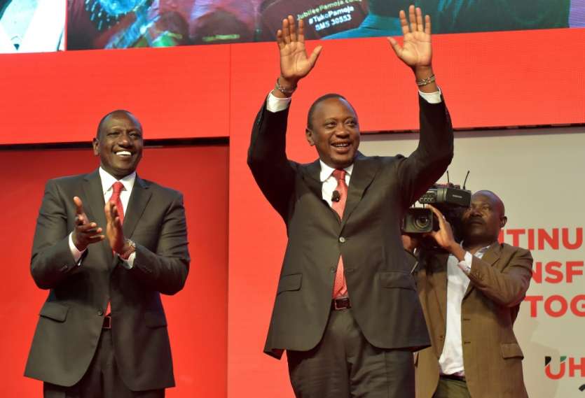 - © 2017 AFP | Crée le 30.07.2017 à 00h34 | Mis à jour le 30.07.2017 à 00h35ImprimerLe président kenyan Uhuru Kenyatta (C) aux côtés du vice-président William Ruto (G) le 26 juin 2017 à Nairobi SIMON MAINA-AFP/Archives