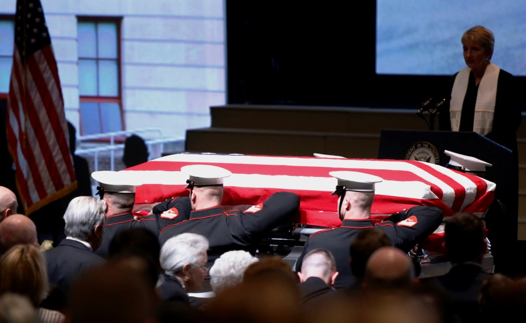 Le cercueil de celui qui avait été le premier Américain à tourner en orbite autour de la Terre, en 1962, était exposé au pied de la scène, recouvert du drapeau américain.