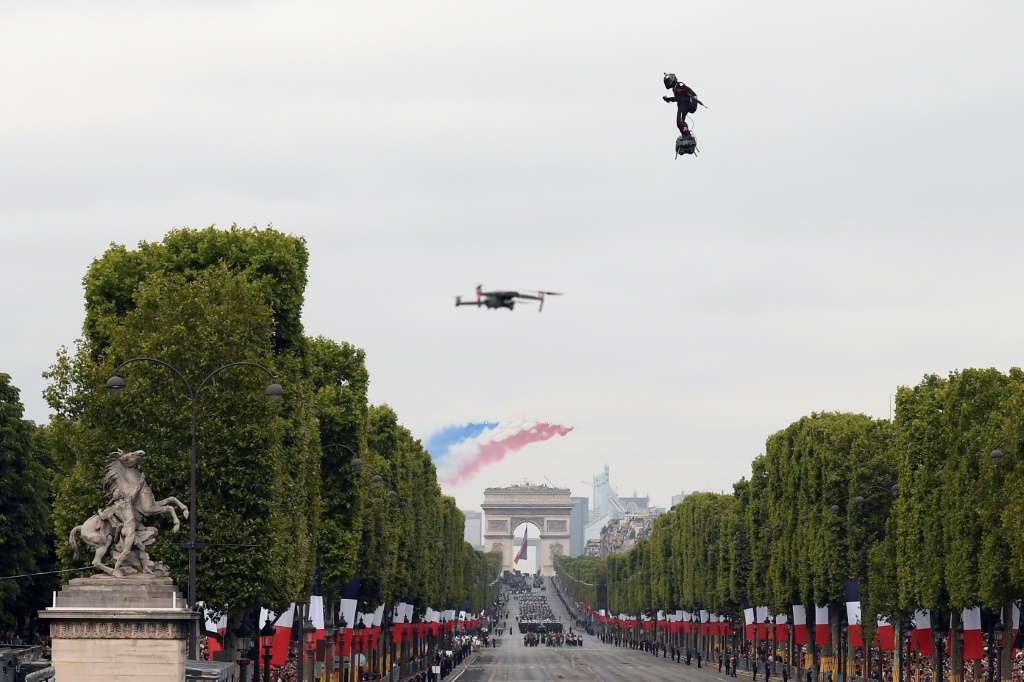 Le 14 juillet, lors du défilé militaire sur les Champs-Elysées à Paris, Franky Zapata avait déjà offert un épatant spectacle futuriste: fusil en main, il avait volé à plusieurs dizaines de mètres du sol sur son invention, "100% développée en France" dans les ateliers de son entreprise au Rove (Bouches-du-Rhône).