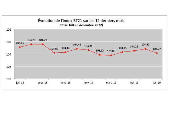 L’Isee (Institut de la statistique et des études économiques) vient de publier l’index BT21, c’est-à-dire tous travaux confondus pour le mois de juillet 2019. Cet indice (provisoire) se traduit par une diminution mensuelle des prix de 0,3 %.