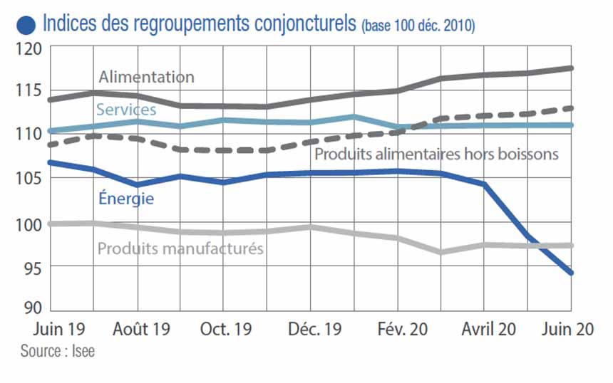 La baisse des prix de l’énergie est essentiellement liée aux carburants qui suivent la chute des cours mondiaux du pétrole. Ainsi, les prix de l’essence et du gazole diminuent en juin de 9,7 %. L’essence à 106,70 F/L à la pompe retrouve des prix de 2016.