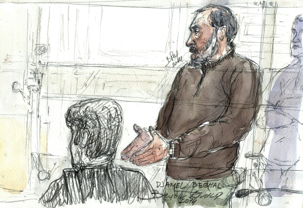 - © 2018 AFP | Crée le 16.07.2018 à 21h08 | Mis à jour le 16.07.2018 à 21h10ImprimerCroquis d'audience de l'islamiste Djamel Beghal lors de son procès, le 7 octobre 2014 à Paris BENOIT PEYRUCQ-AFP/Archives