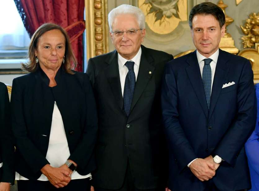 - © 2019 AFP | Crée le 05.09.2019 à 22h03 | Mis à jour le 05.09.2019 à 22h05ImprimerLe président italien Sergio Mattarella, entouré du Premier ministre Giuseppe Conte et de la ministre de l'Intérieur Luciana Lamorgese, lors de la cérémonie de prestation de serment à Rome le 5 septembre 2019 Andreas SOLARO-AFP