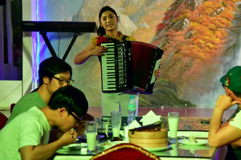- © 2017 AFP | Crée le 29.09.2017 à 20h07 | Mis à jour le 29.09.2017 à 20h10ImprimerDes clients dînent au son d'un accordéon dans le restaurant nord-coréen Okryu-gwan, à Dubaï, le 21 septembre 2017 GIUSEPPE CACACE-AFP