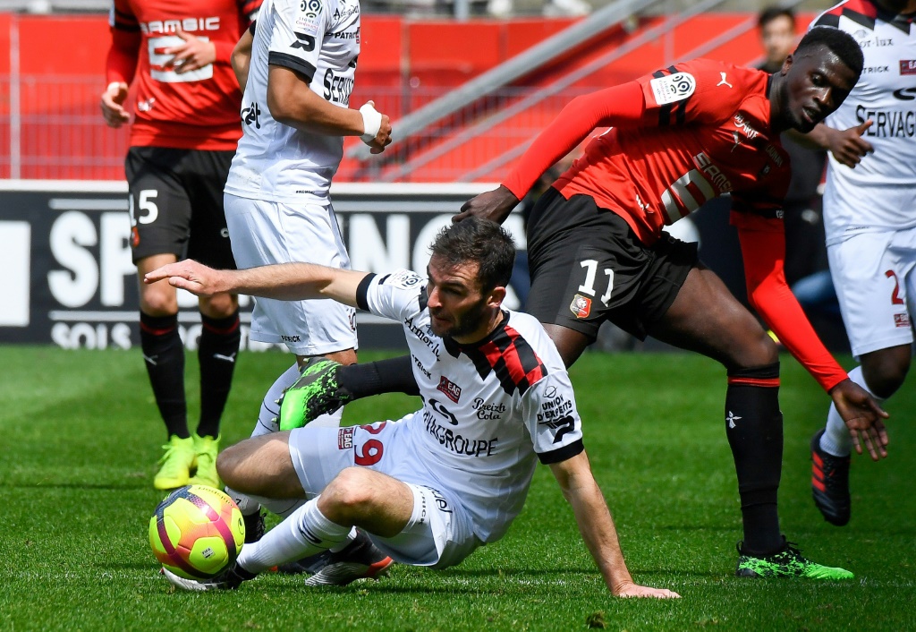 - © 2019 AFP | Crée le 13.05.2019 à 01h58 | Mis à jour le 13.05.2019 à 02h00ImprimerLe défenseur de Guingamp Christophe Kerbrat (g) lors du match nul 1-1 à Rennes le 12 mai 2019 DAMIEN MEYER-AFP