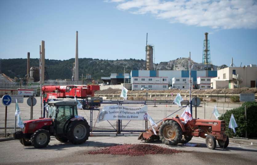 - © 2018 AFP | Crée le 11.06.2018 à 21h26 | Mis à jour le 11.06.2018 à 21h30ImprimerDes agriculteurs bloquent avec leurs tracteurs l'accès à la bioraffinerie Total de La Mède, le 11 juin 2018 à Châteauneuf-les-Martigues, dans les Bouches-du-Rhône BERTRAND LANGLOIS-AFP