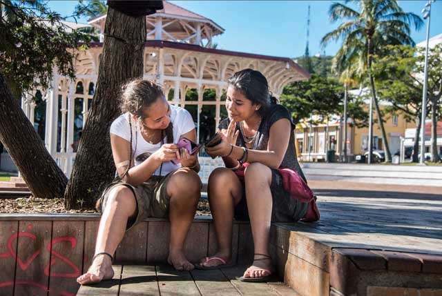 - | Crée le 04.09.2020 à 11h45 | Mis à jour le 04.09.2020 à 11h56ImprimerDeux personnes connectées via leur smartphone, place des Cocotiers, à Nouméa. Photo archives LNC