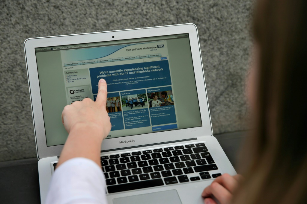 - © 2017 AFP | Crée le 16.05.2017 à 11h21 | Mis à jour le 16.05.2017 à 11h25ImprimerUne femme montre le site Web du NHS (East and North Hertfordshire), informant les utilisateurs d'un problème dans son réseau, à Londres le 12 mai 2017 Daniel LEAL-OLIVAS-AFP/Archives