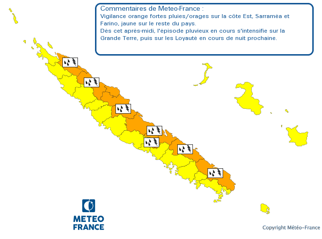 Dans son bulletin météorologique, Météo France annonce que la vigilance orange fortes pluies et orage a été activé sur toutes les communes de la côte Est, ainsi que sur Farino et Sarraméa.