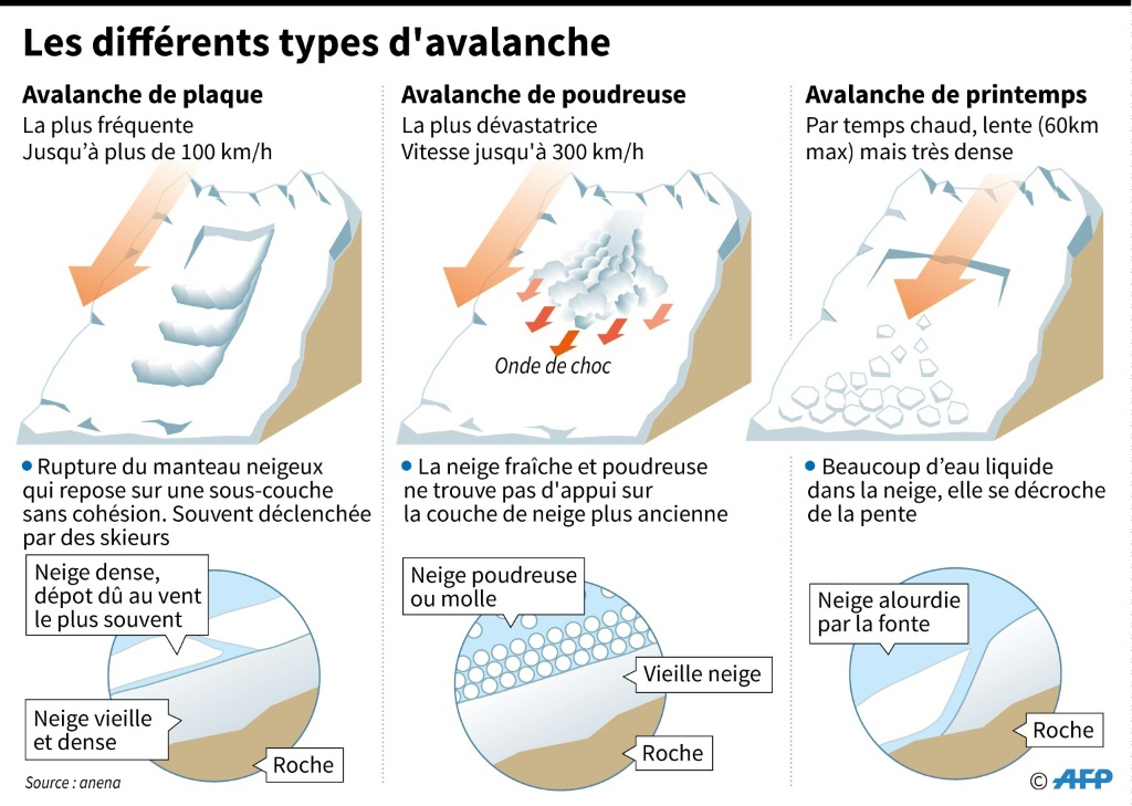 - © 2018 AFP | Crée le 09.01.2018 à 02h46 | Mis à jour le 09.01.2018 à 02h50ImprimerLes différents types d'avalanche Sophie RAMIS, Simon MALFATTO-AFP