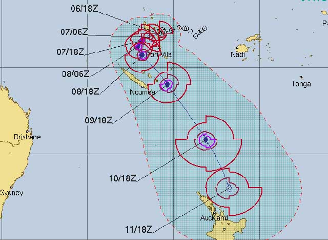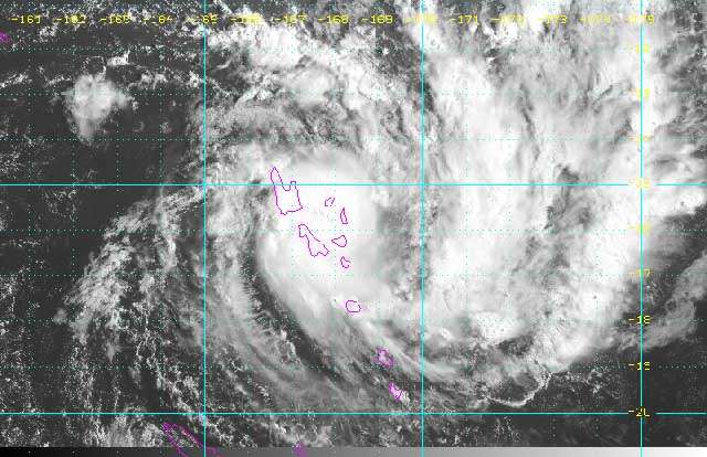 Hier après-midi, la tempête tropicale Hola se trouvait à 210 km au nord nord-est de Port Vila et à 750 km au nord nord-est de Nouméa. Le système se déplace en direction de l'ouest sud-ouest à la vitesse de 15 km/h, avec des vents moyens de 66 km/h près du centre, des rafales de 85 km/h et une pression de 994 hPa en son centre.